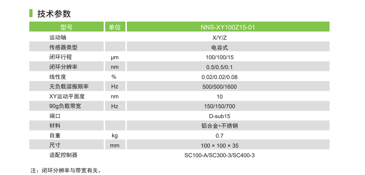 NNS-XY100Z15-01是一款高精度三維納米定位平臺(tái)。具有尺寸小,頻率高,帶寬高,精度高的特點(diǎn)。行程100/100/15μm,分辨率 0.5/0.5/0.1nm。